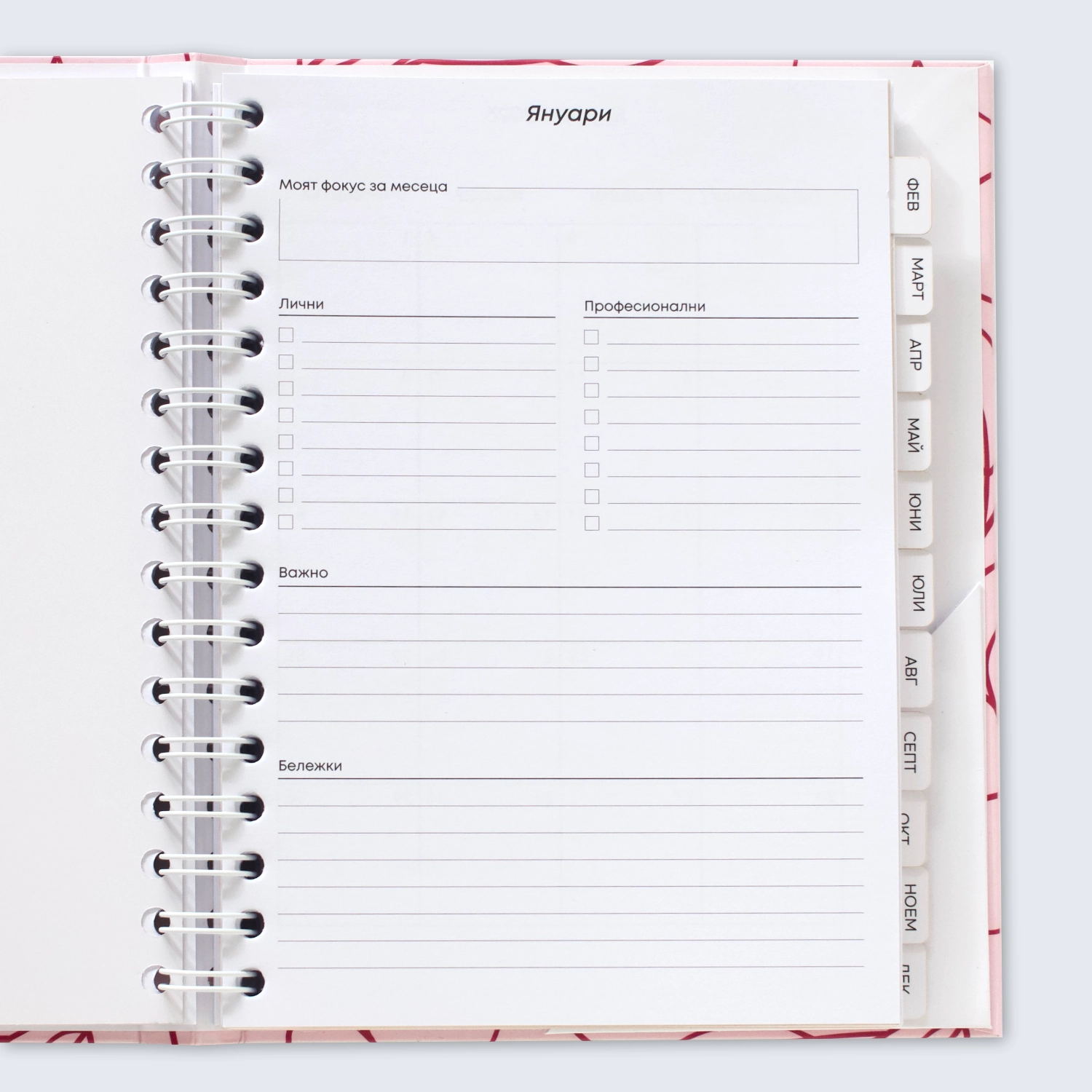 Задаваш твоя фокус за месеца, като това може да бъдат твоите цели, стремежи, насока или любим цитат. Можеш да запишеш в твоя планер 2026 своите лични и професионални цели или задачи.