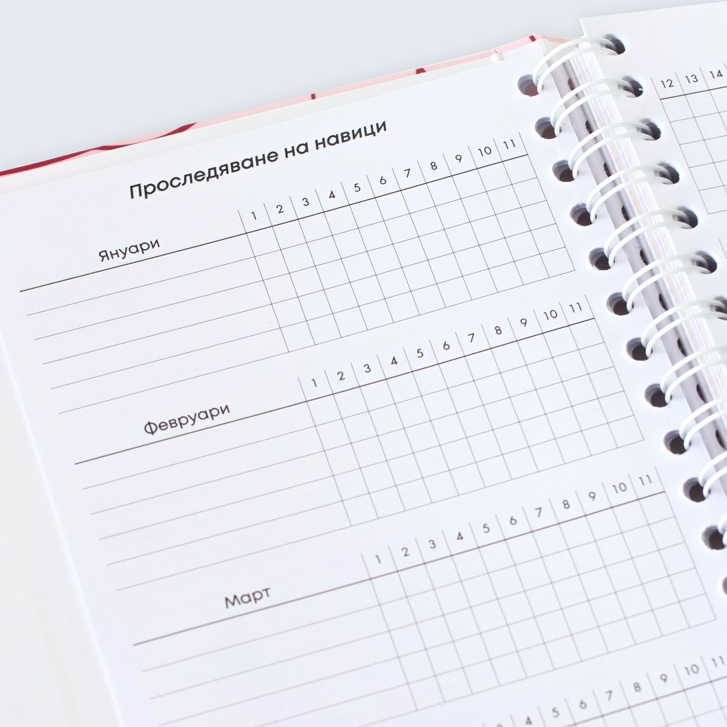 Можеш да проследяваш в твоя планер 2026 основните приходи, разходи и спестявания на месечна база. Проследявай и до пет различни навика за всеки месец от годината.